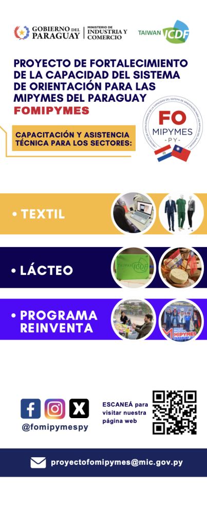 El PROYECTO DE FORTALECIMIENTO DE LA CAPACIDAD DEL SISTEMA DE ORIENTACIÓN PARA LAS MIPYMES DEL PARAGUAY, es el resultado de un convenio celebrado entre el Gobierno de la República del Paraguay, a través del Ministerio de Industria y Comercio, y, el Gobierno de la República de China (Taiwán), a través de la Embajada de la República de China (Taiwán) en el Paraguay